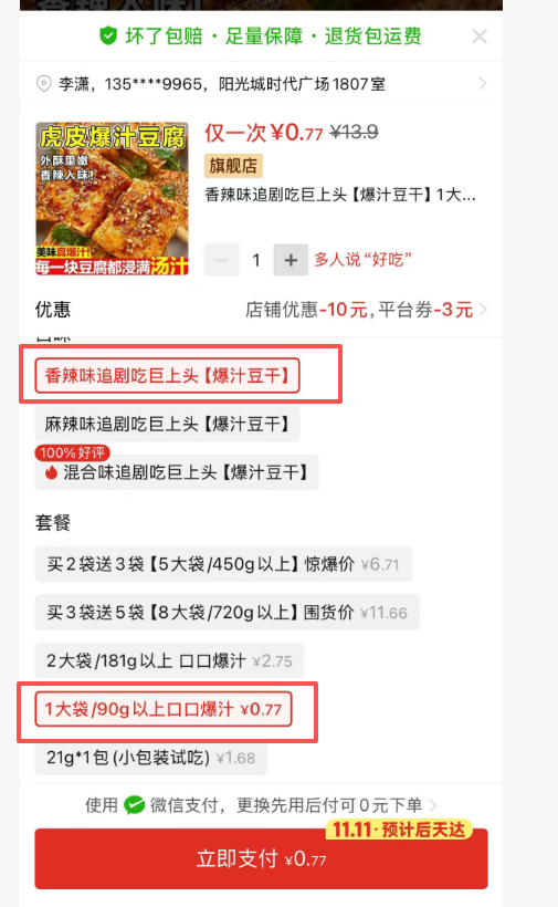 ③香辣味豆干 1大袋(豆干帮忙另外装一个塑料袋再打包,怕破了污染其他商品)